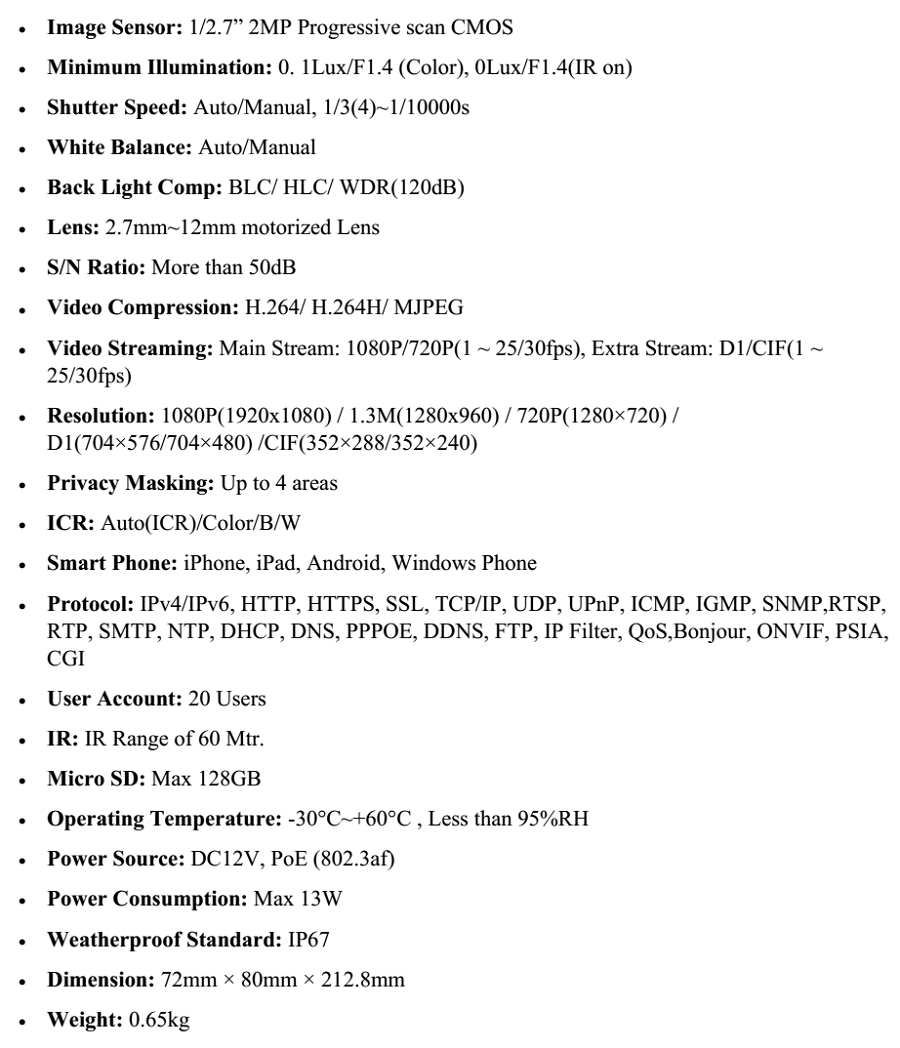 CP-UNC-TB20ZL6-MD Bakco 28/08/2021 Comments Off on CP-UNC-TB20ZL6-MD CP PlusCamera IP Bullet 2 megapixel, H264+, IP67, 2.7~12mm motorized varifocal LensThông số kỹ thuậtXuất xứ: CP Plus / Đức (EU)Bảo hành: 12 thángGiá: Liên hệ